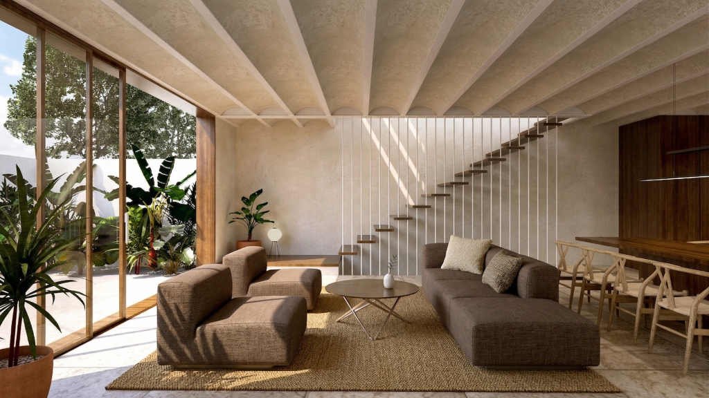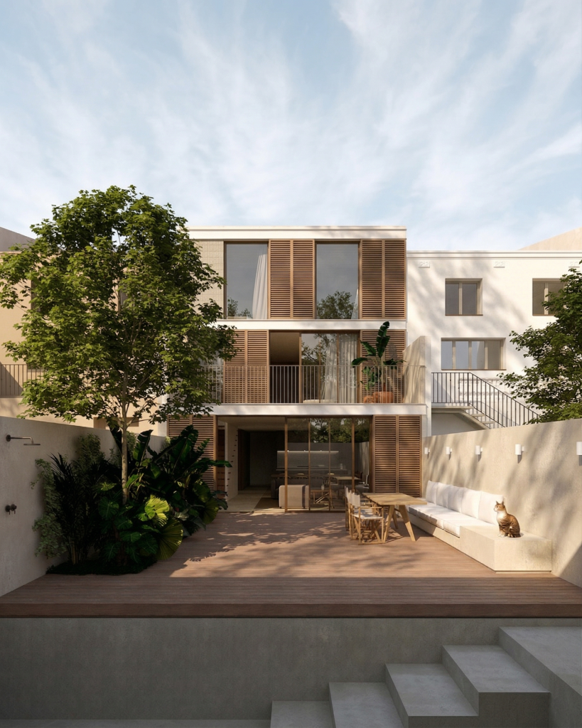 Aquesta vivenda d’obra nova a Badalona reinterpreta la tipologia tradicional de la casa de cos per transformar-la en un habitatge on la llum i la claredat estructural defineixen l’espai. El projecte aposta per la sinceritat constructiva, deixant els forjats de biguetes i revoltons vistos per generar un ritme horitzontal que amplia visualment la percepció de l’estretor de la parcel·la. A la planta baixa, la zona de dia es configura com un àmbit diàfan i continu que busca la connexió directa amb un pati posterior amb piscina, concebut com un oasi de vegetació i calma dins la trama urbana.
