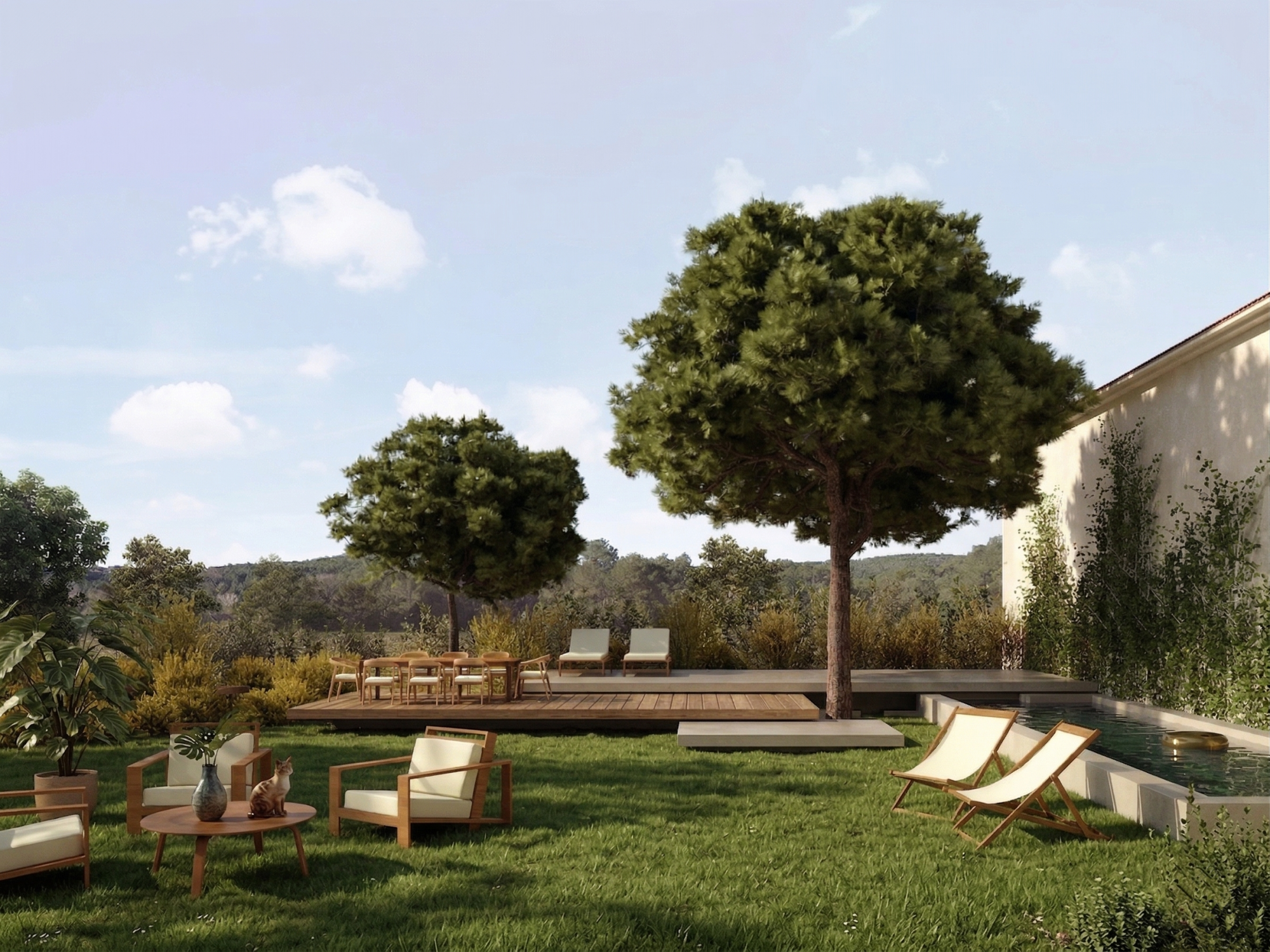 L’arquitectura del jardí s’organitza a través d’aquestes superfícies de fusta i formigó, que funcionen de manera autònoma però connectada: un primer àmbit destinat a menjador exterior, un segon nivell per al solàrium i un conjunt d’esglaons que resolen de forma natural l’accés a la làmina d’aigua. Aquest joc de plataformes no només jeraritza el programa funcional, sinó que actua com un element de transició suau entre l’habitatge i el paisatge de l’Empordà.