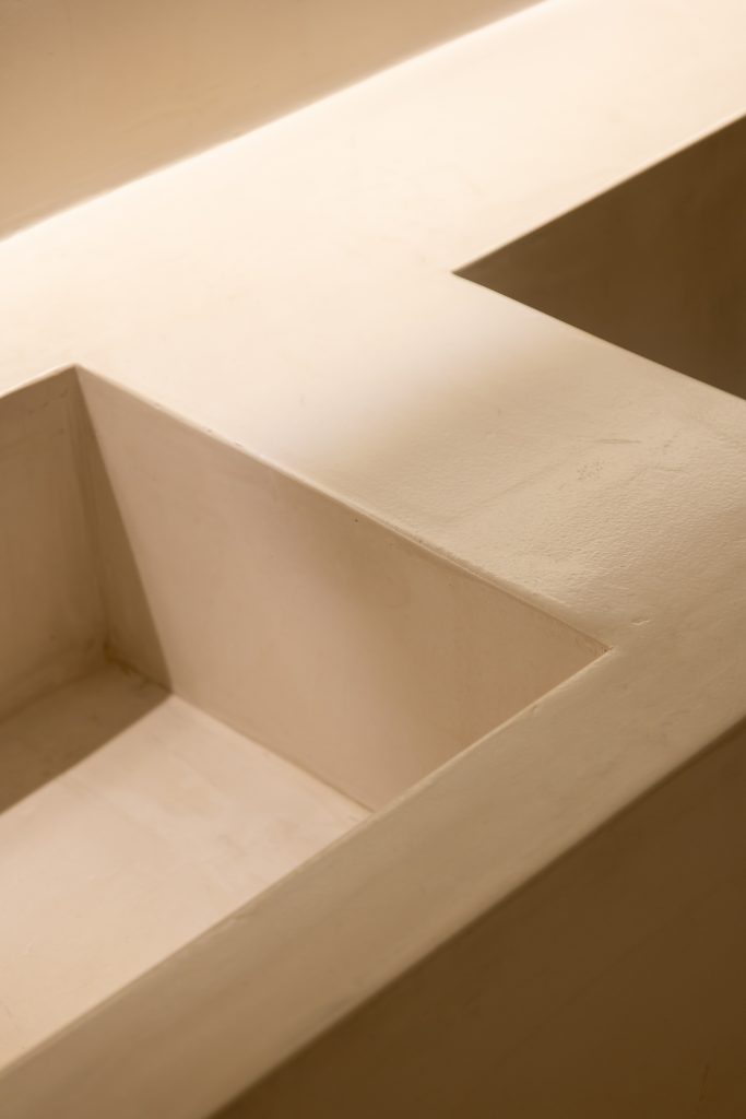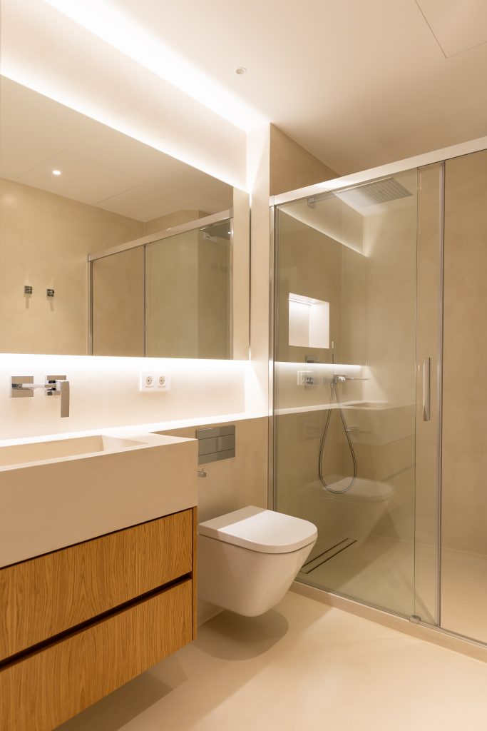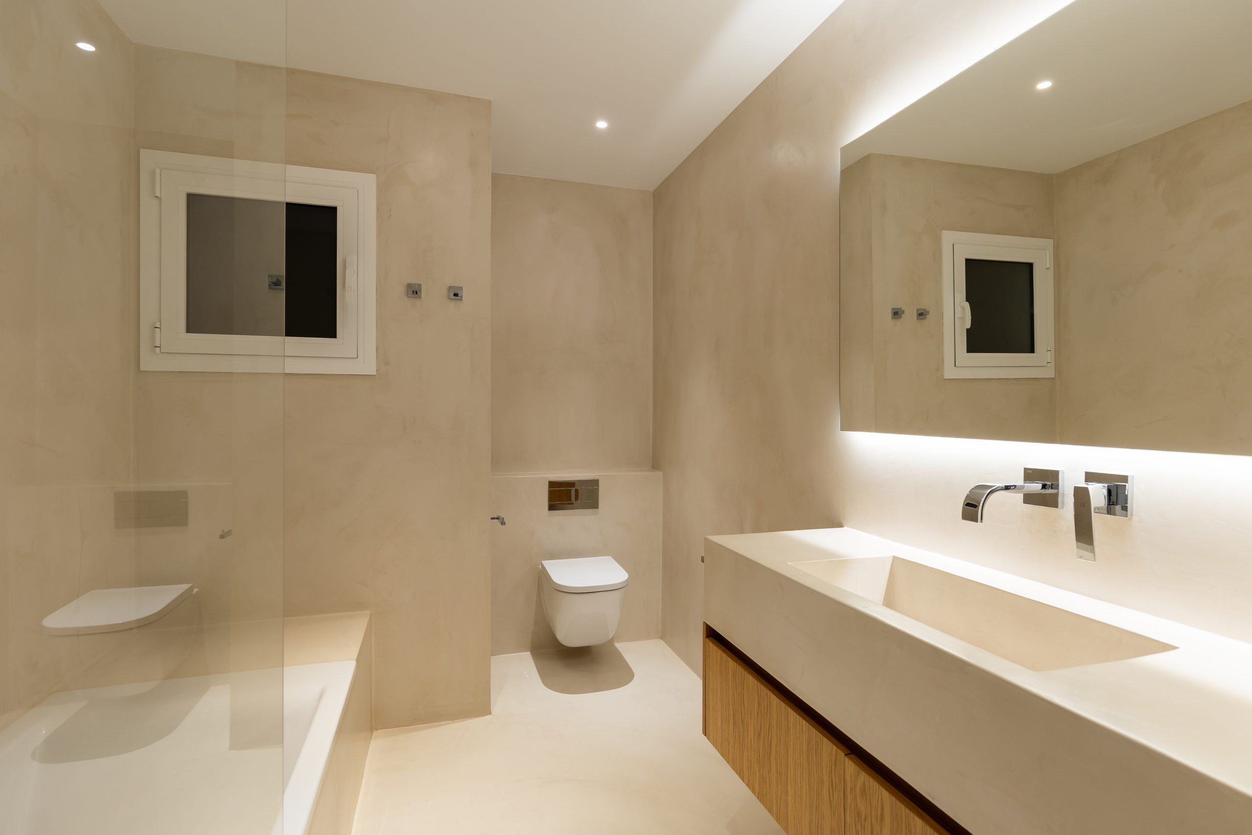 S’utilitza el microciment en tonalitats clares i neutres per a crear superfícies contínues en banys, aportant un toc modern, minimalista i augmentant la sensació d’amplitud gràcies a l’absència de juntes.