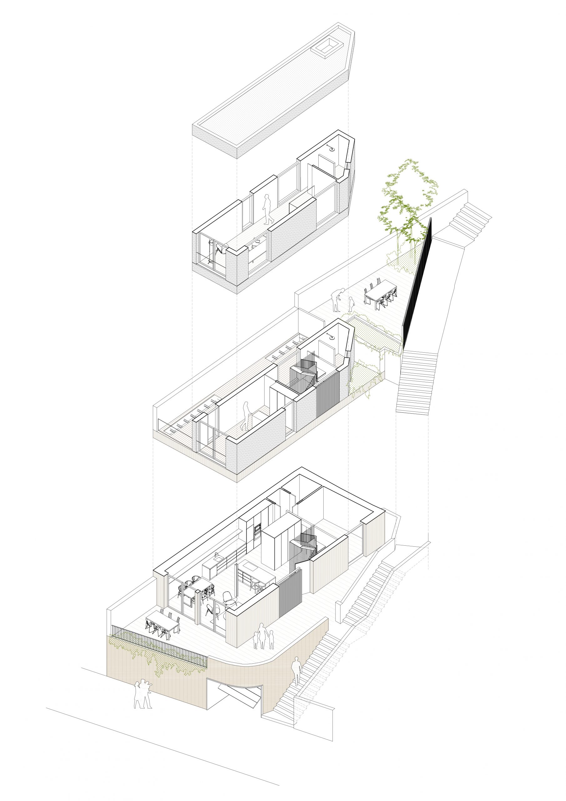 L’actuació transforma una planta baixa en un habitatge de tres nivells (PB+2), adaptant-se a la crujia estreta de la parcel·la i aprofitant al màxim la seva geometria allargada.