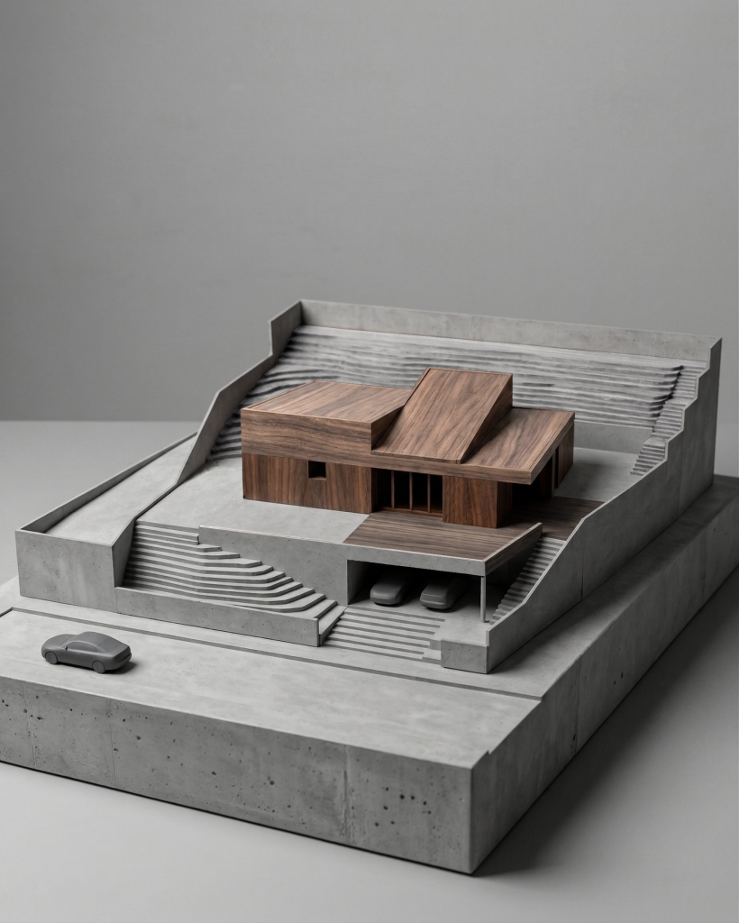 Habitatge unifamiliar aïllat situat a Terrassa, on la forta topografia del terreny esdevé l’oportunitat per definir l’estratègia del projecte. El volum, organitzat en planta baixa i soterrani, s’encasta en el vessant per minimitzar el seu impacte i, alhora, elevar-se per capturar les vistes panoràmiques del paisatge.